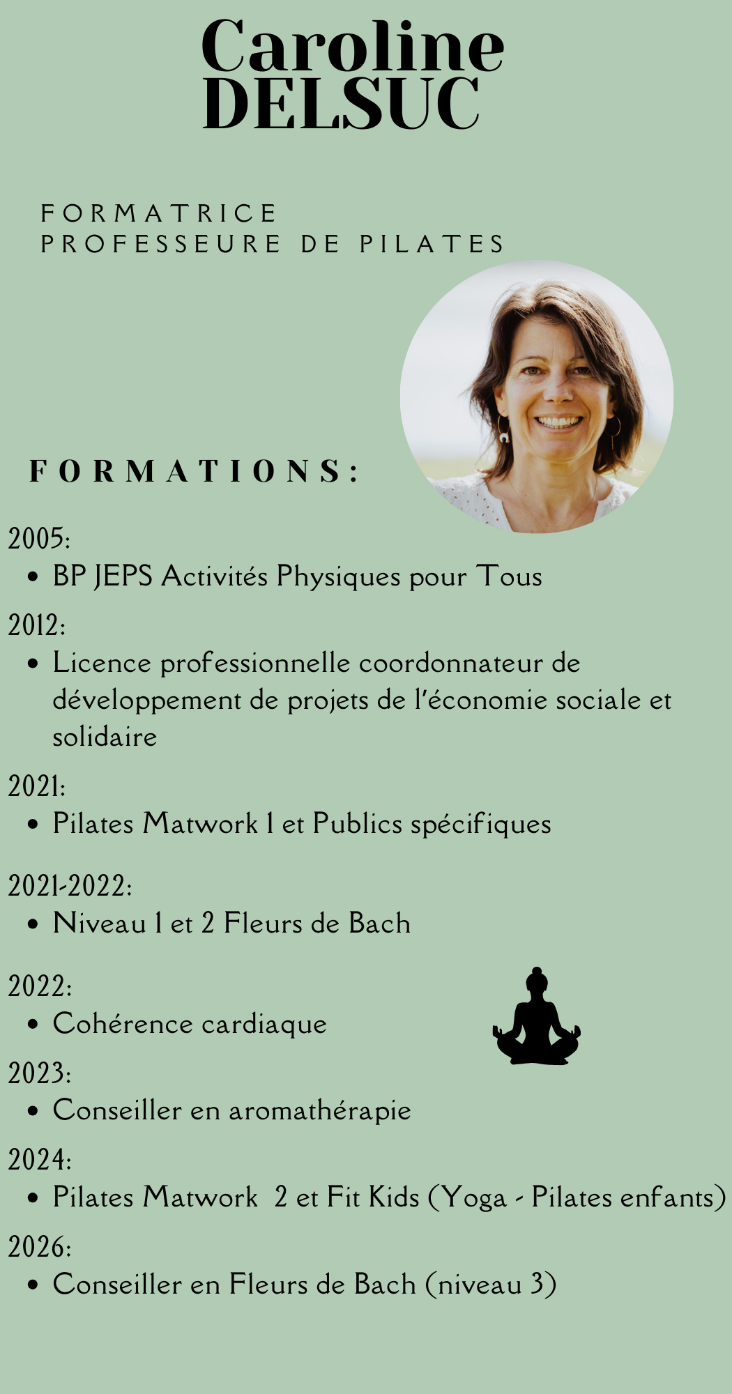 Etant déjà titulaire d’un BP JEPS Activité Physique pour Tous, j’ai choisi de me former au studio évolution de Quint Fontgrive pour le Matwork I (1er niveau) et les publics « spécifiques » (personnes âgées, en surpoids, femmes enceintes…), j’ai ensuite poursuivi avec le Matwork 2 dans le studio Pilates and Core de Jonzac, où j’ai également suivi la formation « Fit Kids » qui permet d’adapter le Yoga et le Pilates aux enfants.